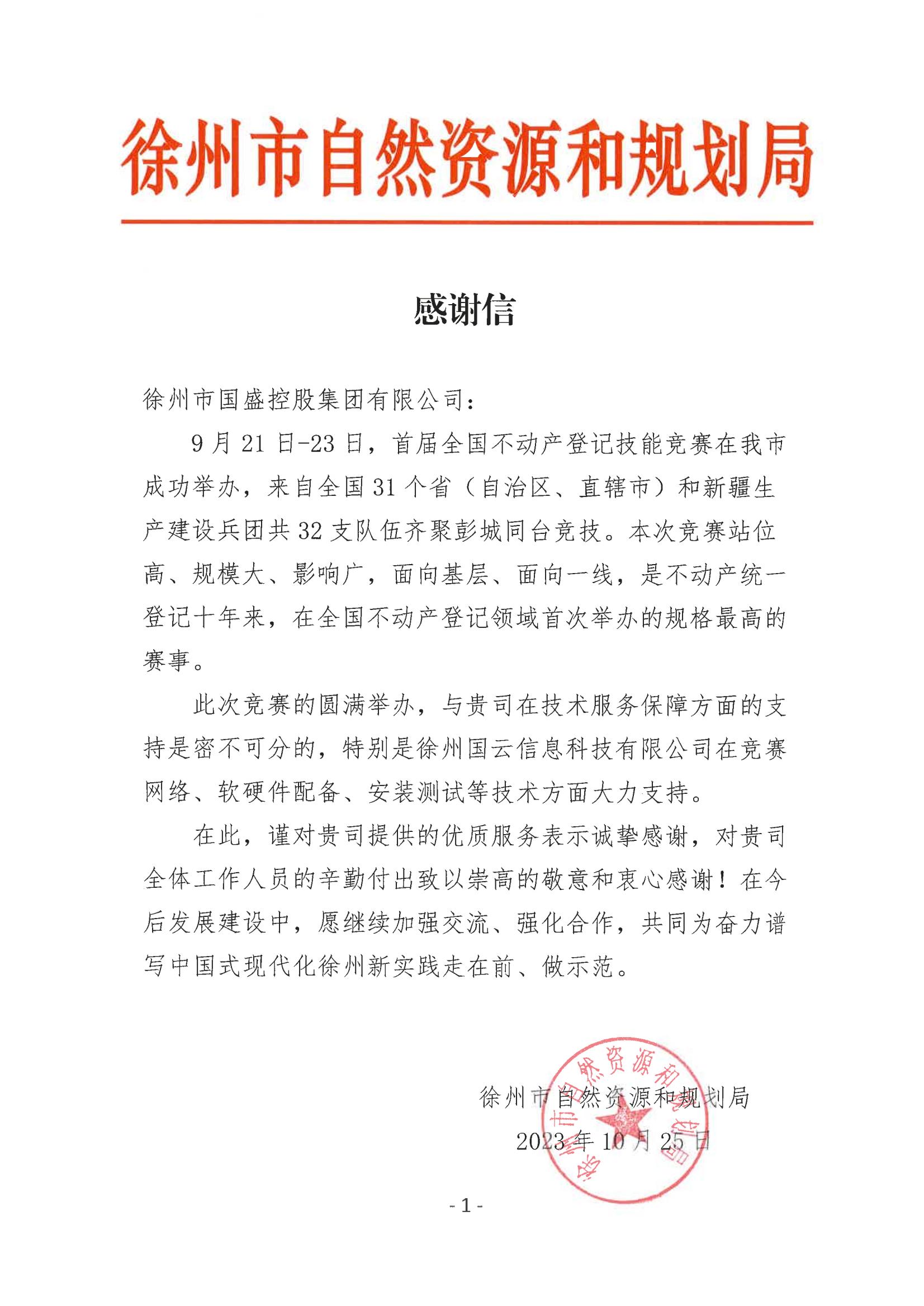 近日,国盛集团收到来自市自然资源和规划局的一封《感谢信》。来信中,市自然资源和规划局对国盛集团在首届全国不动产登记技能竞赛(以下简称“竞赛”)举办过程中,为本届赛事提供的优质服务和大力支持表示感谢。